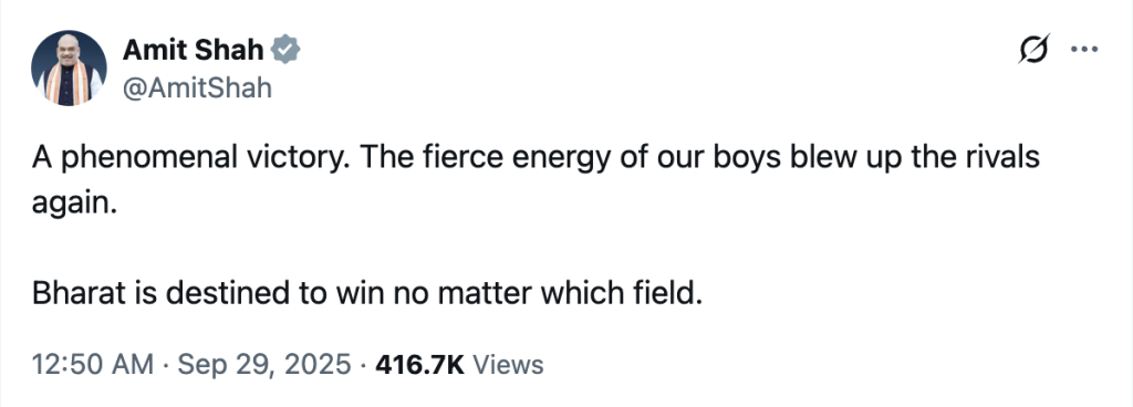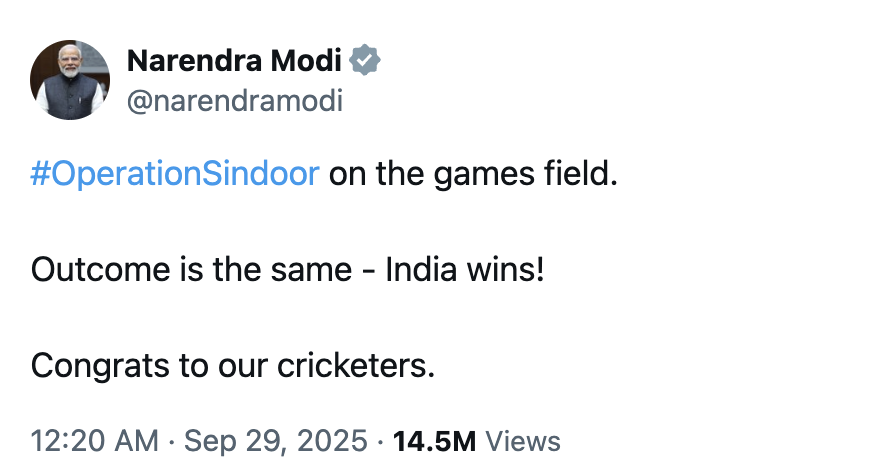 Leading the pack is prime minister Narendra Modi, who wrote, "Operation Sindoor on the games field. Outcome is the same – India wins! Congrats to our cricketers."