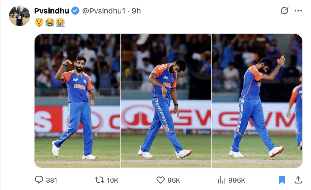 Star badminton Olympian P.V. Sindhu shared three images of cricketer Jasprit Bumrah appearing to mimic the downing of jets – ostensibly a reference to Operation Sindoor.