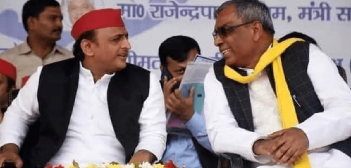 Akhilesh Yadav and O.P. Rajbhar. Photo: Twitter/@VishvanathYad11