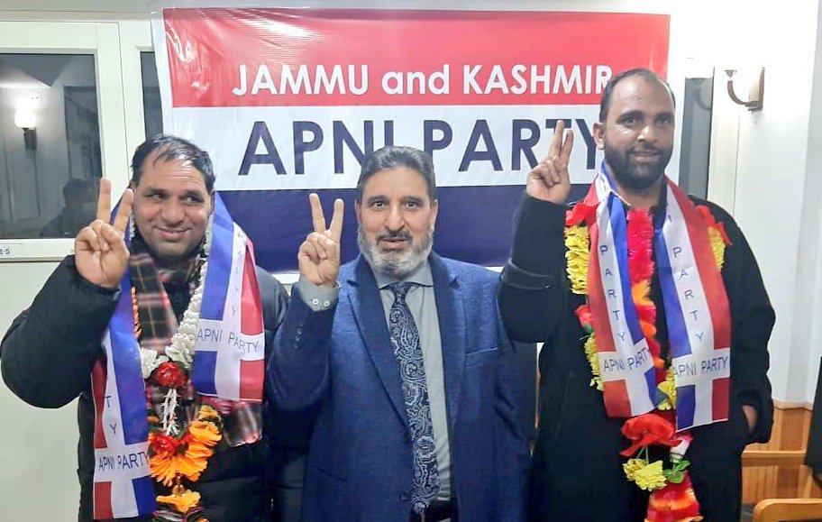 Altaf Bukhari with two DDC polls candidates who joined J&K Apni Party in Shopian. Photo: Twitter/@Apnipartyonline