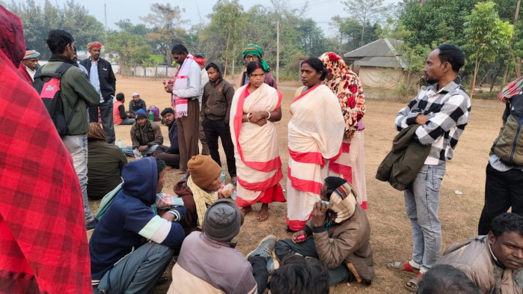 Santal people sit in protest at the Barikul police station grounds on December 12, 2025. Photo: Madhu Sudan Chatterjee.