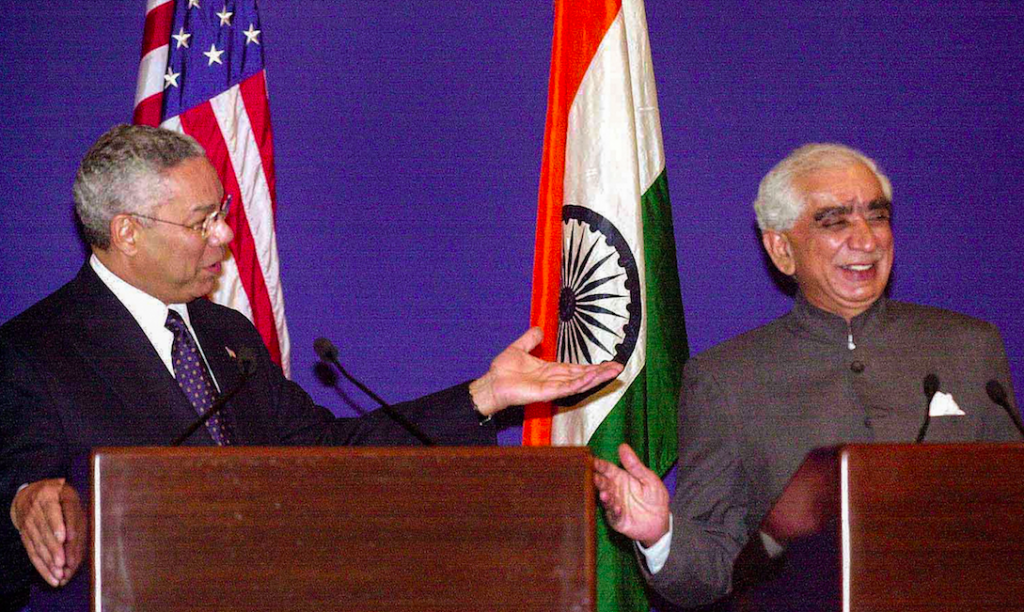 A 2001 photo of Union minister Jaswant Singh with U.S. Secretary of State Colin Powell in New Delhi. Photo: PTI