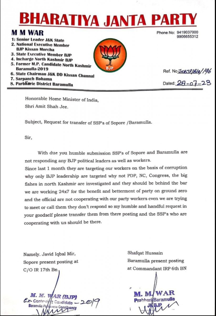 In the letter, M.M. War has claimed that these police officers were targeting BJP leaders for the past one month and were not investigating leaders of the National Conference and Peoples Democratic Party and other big fishes, who, he said, should have been behind bars.