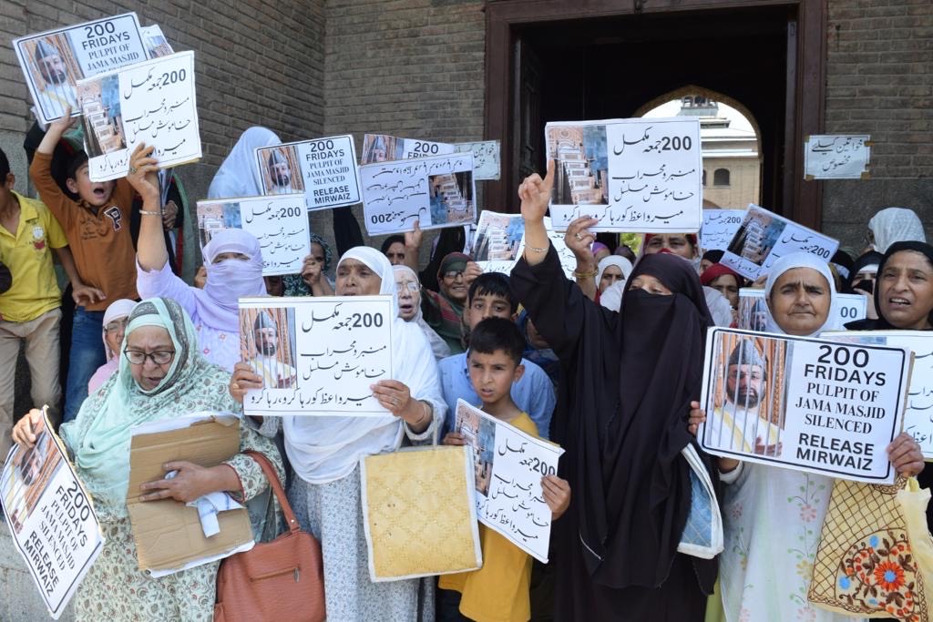Protests demanding the release of moderate Hurriyat chairman and chief cleric of Kashmir, Mirwaiz Umar Farooq at Srinagar’s Jamia Masjid on June 23, 2023. Photo: Special arrangement.