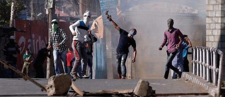 File photo: Demonstrators hurl stones towards policemen during a protest in Srinagar, against the recent killings in Kashmir region, September 25, 2016. Credit: Reuters/Danish Ismail/Files