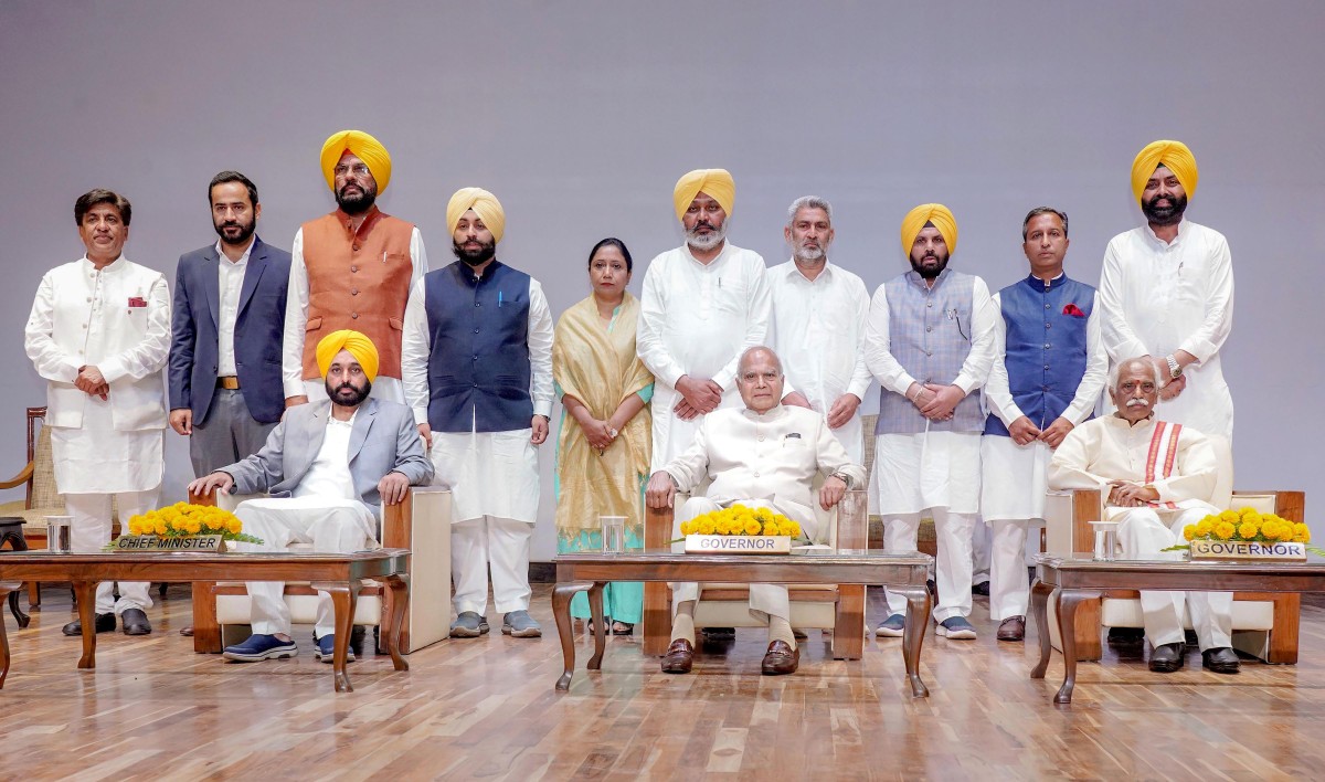 Governor of Punjab Banwarilal Purohit with Punjab CM Bhagwant Mann and the newly sworn-in state Cabinet ministers, pose for photographs at Raj Bhawan in Chandigarh, Saturday, March 19, 2022. Photo: PTI