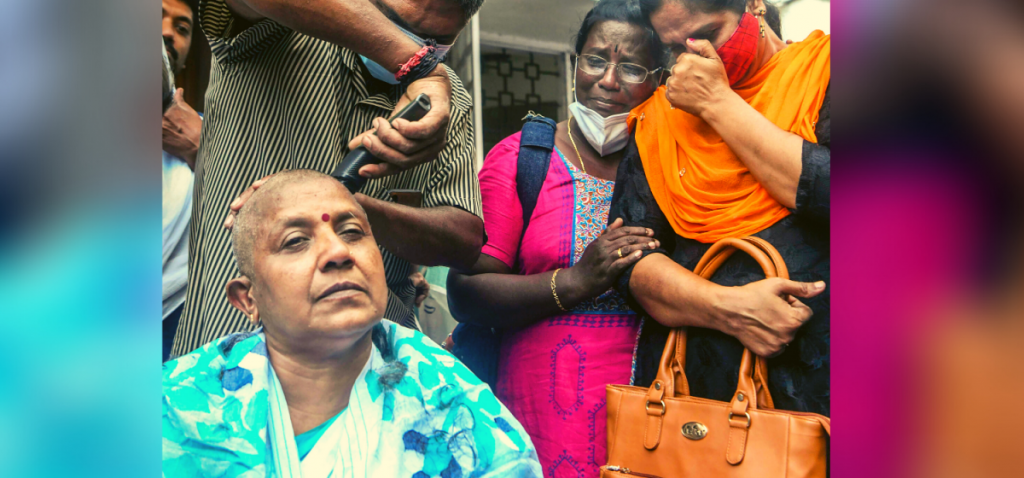 Kerala Mahila Congress Chief Lathika Subhash gets her head tonsured in front of the KPCC office, in protest against the denial of party ticket in the forthcoming assembly elections in Thiruvananthapuram, Sunday, March 14, 2021. Photo: PTI.