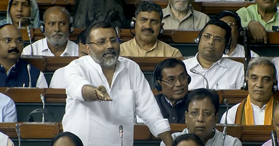 Pictured here speaking in the no-confidence motion debate, BJP MP Nishikant Dubey had earlier accused the Congress of receiving funds from China. Photo: Screenshot from YouTube.