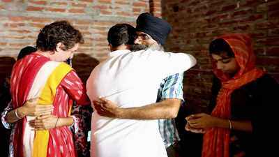 Congress leaders Priyanka Gandhi Vadra (left) and Rahul Gandhi meeting the family members of deceased farmer Lavpreet Singh in Lakhimpur Kheri on October 6. Photo: PTI.