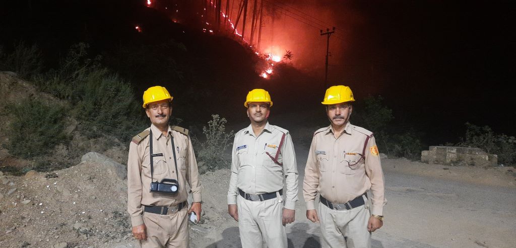 It’s around 11 pm now. A little before Rewalsar, about 25 km from Mandi, a fire is raging in the pine forest. A fire brigade vehicle has arrived.