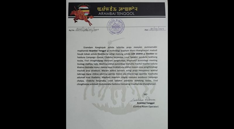 New Delhi: The Manipur state government and the Union government – both ruled by the Bharatiya Janata Party – have stayed silent as Meitei militia group Arambai Tenggol publicly issued restrictions on traditional campaign methods during the Lok Sabha elections in the state. Arambai Tenggol's Laishram Robason, popularly known as the 'Control Room Operator', issued a press release prohibiting public gatherings, feasts, the use of loudspeakers, flag raising and spreading election messages through loudspeakers during the campaign, reports India Today NE.