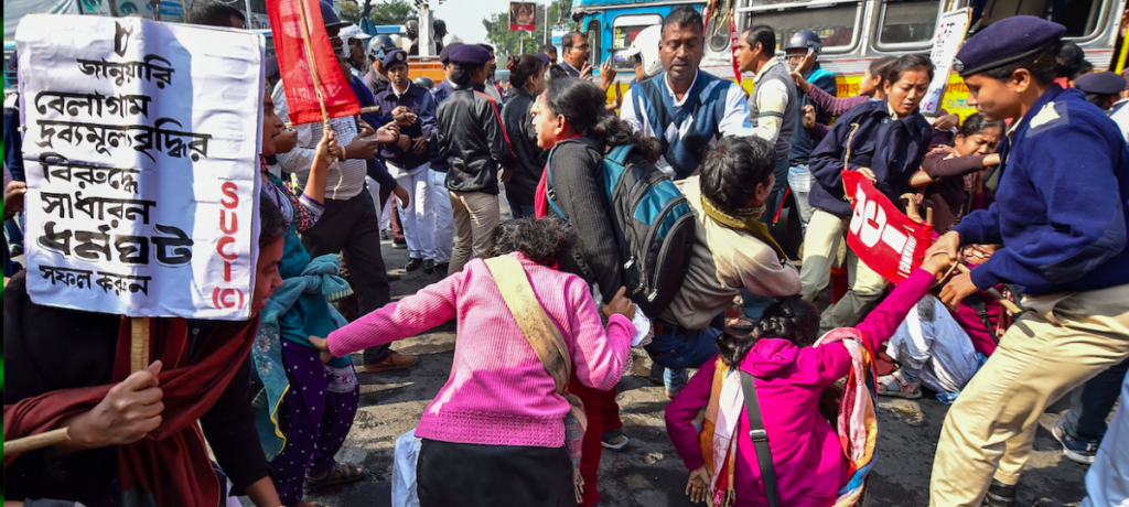 More even than numbers, it is the composition that makes the protests of January 8 remarkable. There were farmers protesting disproportionately low prices for their produce; workers from MNREGA and other government schemes protesting non-payment of wages; bank and government employees, transport workers, workers from public sector industries such as mining, steel and defence production; port and dock workers and telecom workers protesting the impact on their lives of a rapidly sinking economy. They were joined by workers from the private sector across industries such as automobile manufacturing, textiles, power, metals, the IT industry. And, of course, students alongside teachers, doctors, scientists, lawyers, the trans and LGBT communities, Dalit and Muslim groups… It was so bad, to quote a catchphrase of our times, that even the famously insular St Stephens’ College, in New Delhi, joined in.
