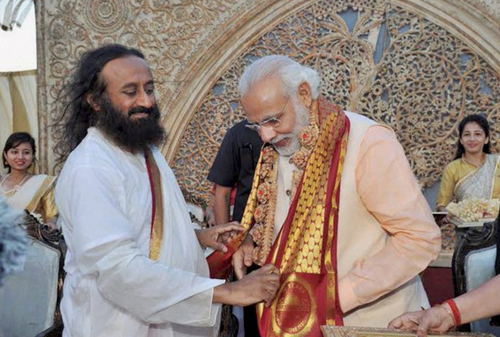 File photo of Prime Minister Narendra Modi being greeted by Art of Living founder Sri Sri Ravishankar during the opening day of the three-day long World Culture Festival on the banks of Yamuna River in New Delhi. Credit: PTI
