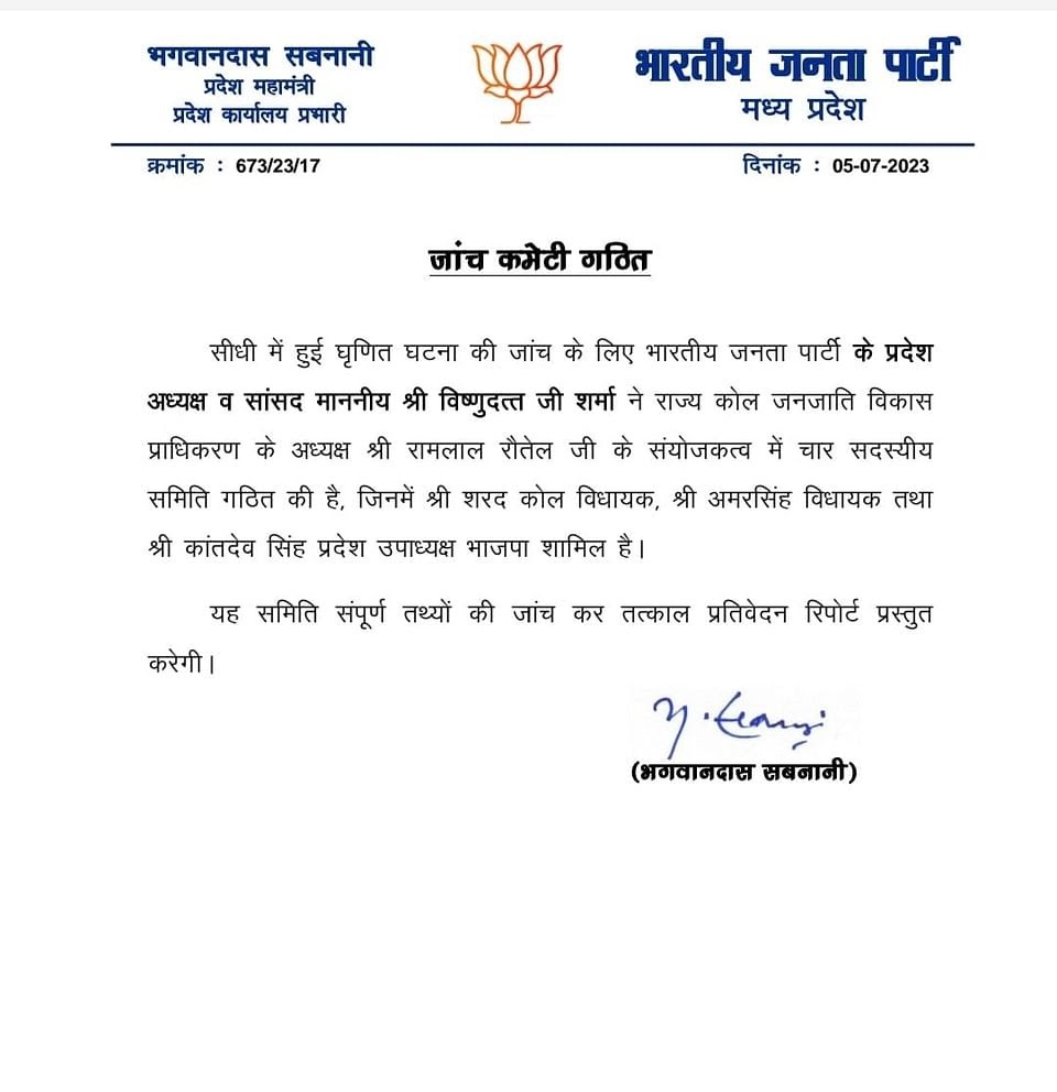 Meanwhile, the state leadership of the BJP has set up an 'inquiry committee' to probe into the incident. The party says that the committee will carry out a thorough investigation into the incident. Ram Lal Routel, chairman of the State Kol Tribal Development Authority and a BJP leader, has been designated as the committee's head. BJP legislators Sharad Kol and Amar Singh, and the party's deputy state president Kantadev Singh will be part of the committee.