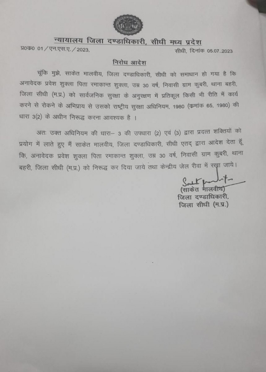 Order Copy of the Sidhi District Magistrate invoking National Security Act (1980) of Sections 3 (2) against the accused.