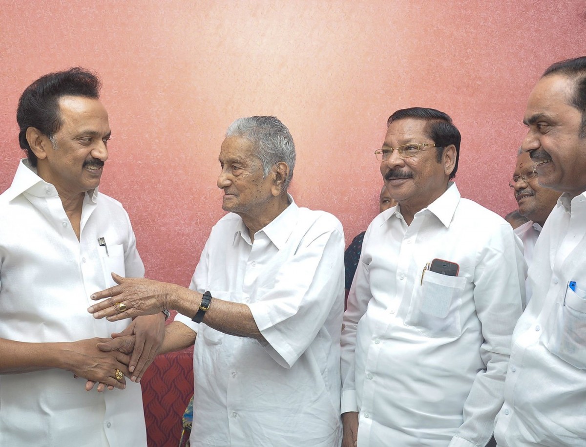 DMK leader M.K. Stalin greeting Sankariah on his 98th birthday in 2019. Photo: S. Gavaskar/ People's Archive of Rural India