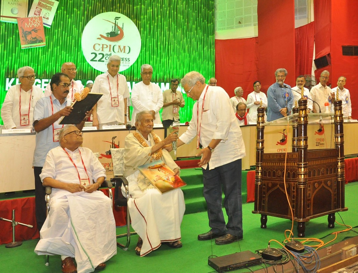 Sankariah and V.S. Achuthanandan, the last living members of the 32 who walked out of the CPI National Council meeting in 1964, being felicitated at that party’s 22nd congress in 2018 by party General Secretary Sitaram Yechury. Photo: S. Gavaskar/ People's Archive of Rural India