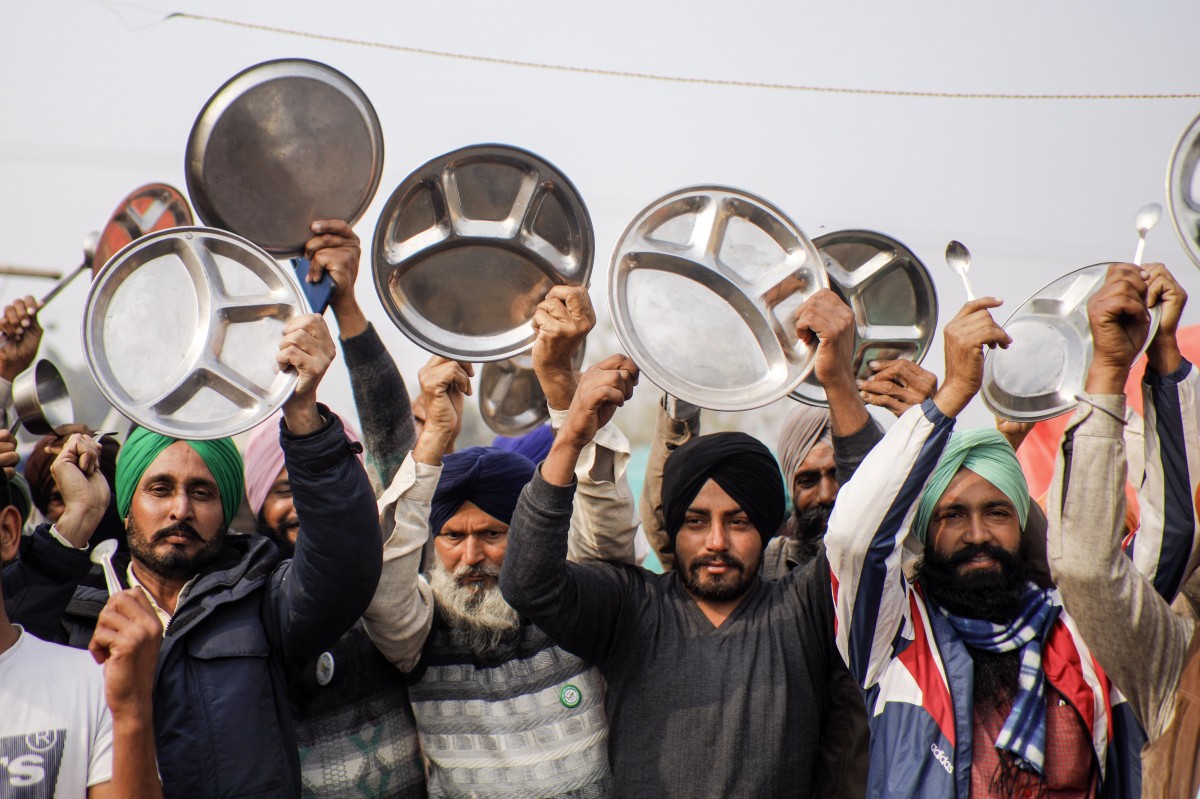 Farmers beat utensils as a protest against PM Modi's 'Man ki Baat' programme, during their ongoing agitation over new farm laws, at Singhu border in New Delhi, Sunday, Dec. 27, 2020. Photo: PTI/Ravi Choudhary