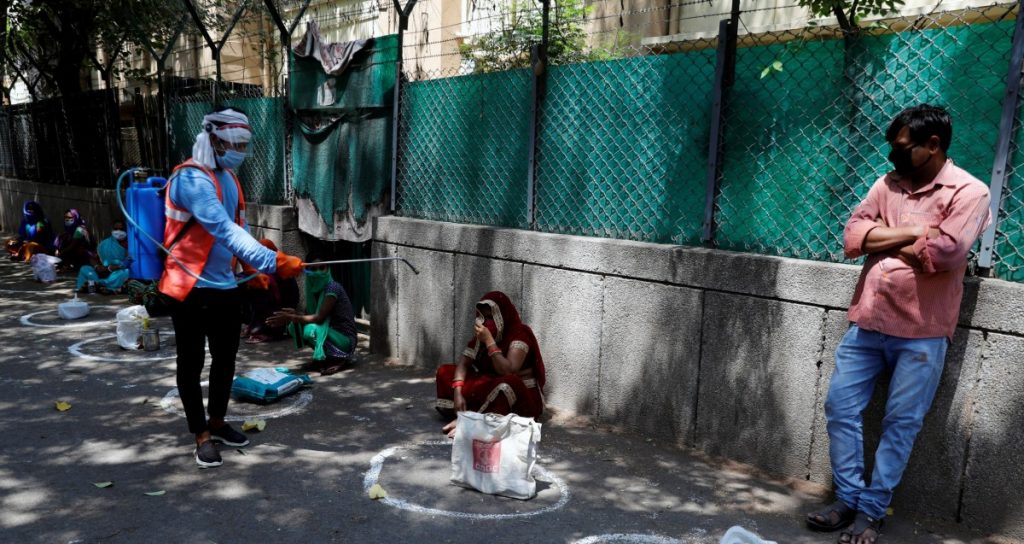 A municipal worker sprays disinfectant on the bags of people, as they maintain social distancing while sitting in a line to receive free food distributed by Delhi government, in a school during an extended nationwide lockdown to slow the spread of the coronavirus disease (COVID-19), in New Delhi, India, April 21, 2020. Photo: Reuters/Anushree Fadnavis