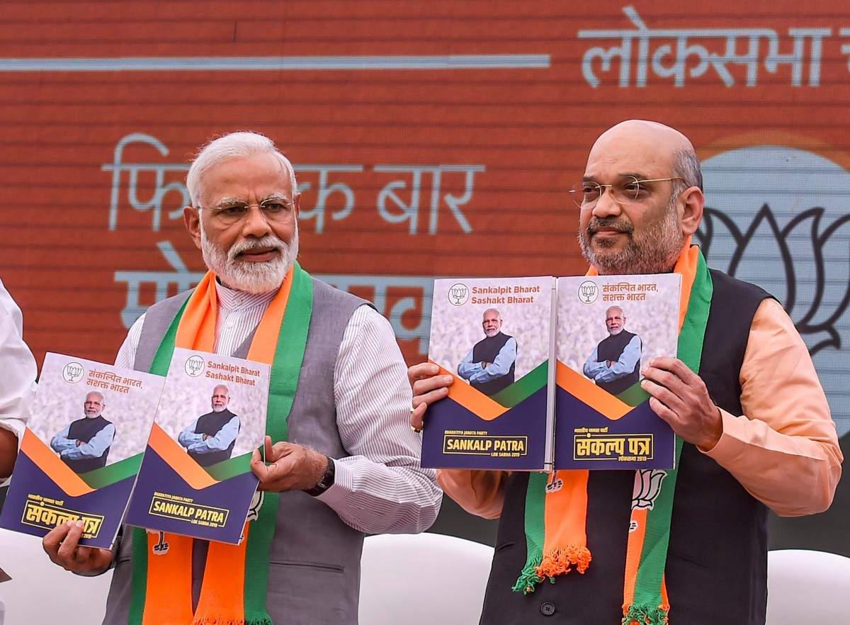 Prime Minister Narendra Modi and BJP president Amit Shah at the party manifesto release. Photo: PTI