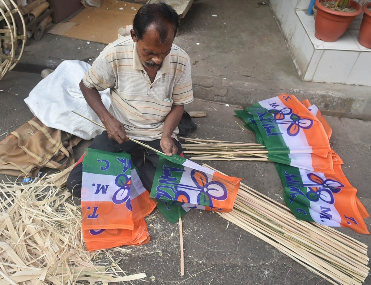 A worker prepares Trinamool Congress (TMC) party flag ahead of Kolkata Municipal Corporation (KMC) election, in Kolkata, Sunday, Nov. 28, 2021. Photo: PTI