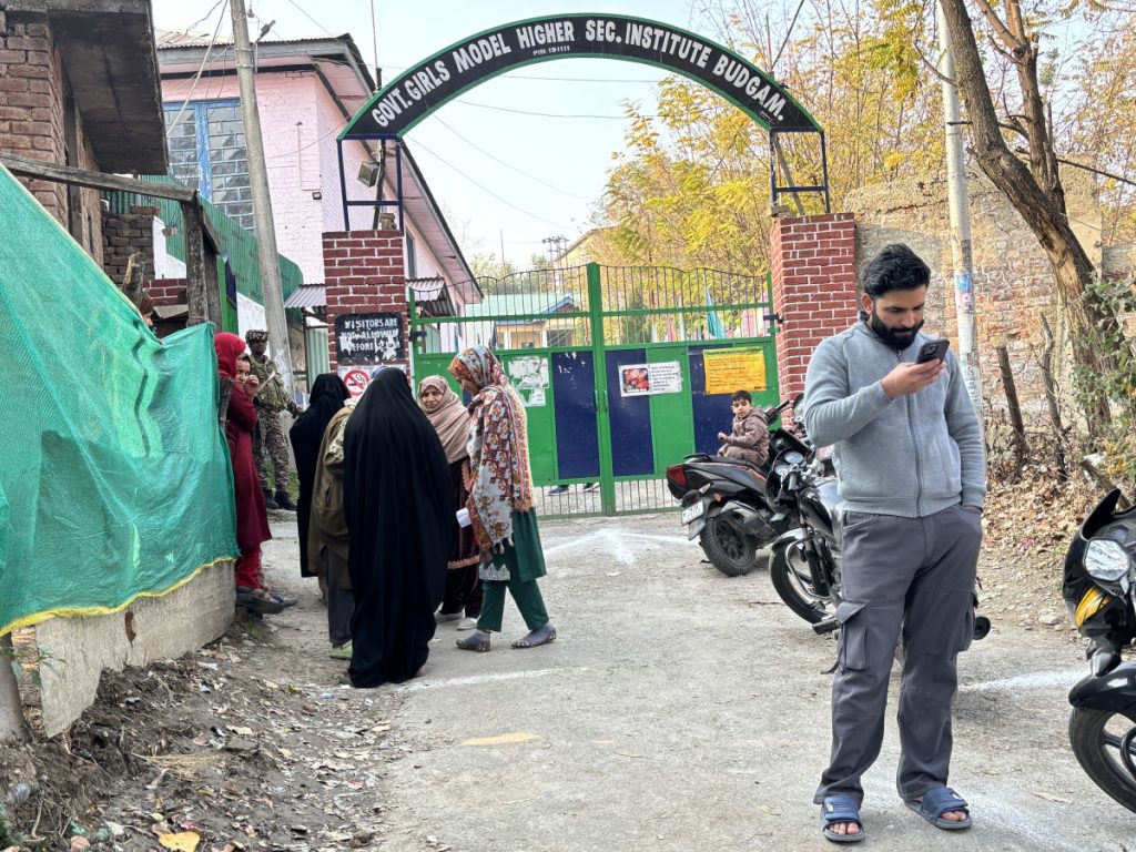 A young man checks his phone after voting while a group of women prepare to enter the polling station at a government-run school in Budgam town on Tuesday, November 11, 2025. Photo: The Wire.