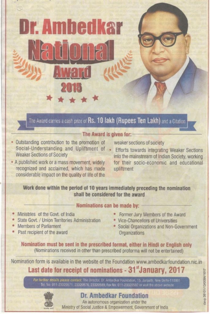 On March 9, 2022, advertisements for handing out the awards were put forward by the Ambedkar Foundation. The national award carries with it a prize of Rs 10 lakh and the international award, a prize of Rs 15 lakh.