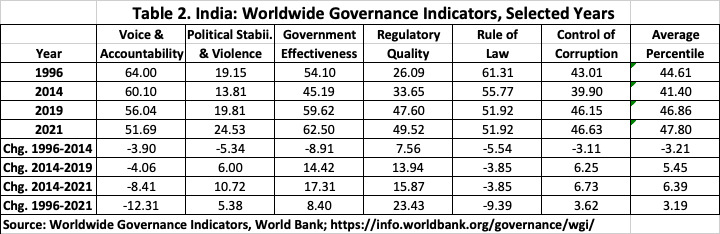 Table 2 shows India’s percentile scores in each of the six dimensions of governance starting in 1996, the earliest year for which the Worldwide Governance Indicators (WGIs), compiled by the World Bank, are available. It should be noted that, unlike the FSIs, a decline in percentile score reflects a worsening of governance relative to other countries in the world. The six dimensions of governance are voice and accountability, political stability and absence of violence, government effectiveness, regulatory quality, rule of law, and control of corruption.