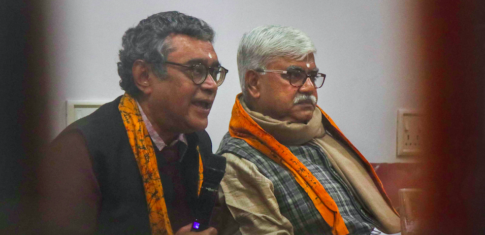 Swapan Dasgupta delivering a lecture on CAA at Visva Bharati VC Bidyut Chakrabarty(R). Photo: PTI