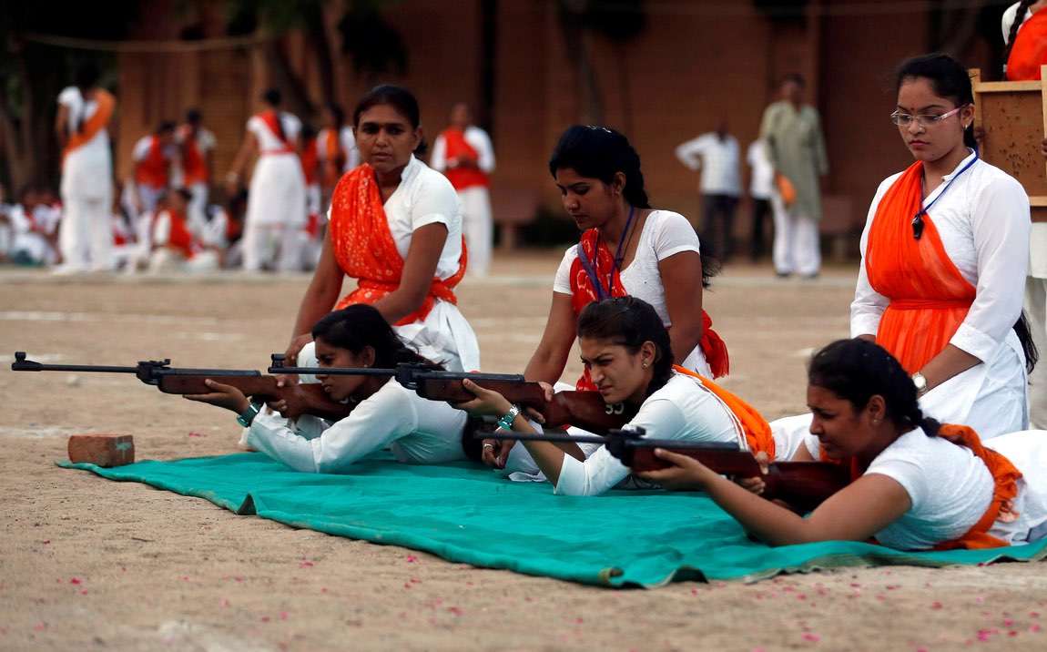 Members of Durga Vahini, the women’s wing of Vishwa Hindu Parishad, show their self-defence skills with firearms at the concluding ceremony of a weeklong women’s training camp on the outskirts of Ahmedabad. Credit: Reuters/Amit Dave