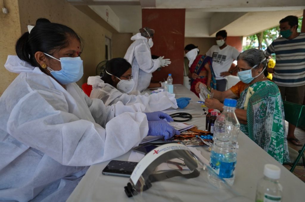Health workers wearing protective gears record details of the residents during a check-up campaign for COVID-19 in Mumbai on July 22, 2020. Photo:Reuters/Hemanshi Kamani