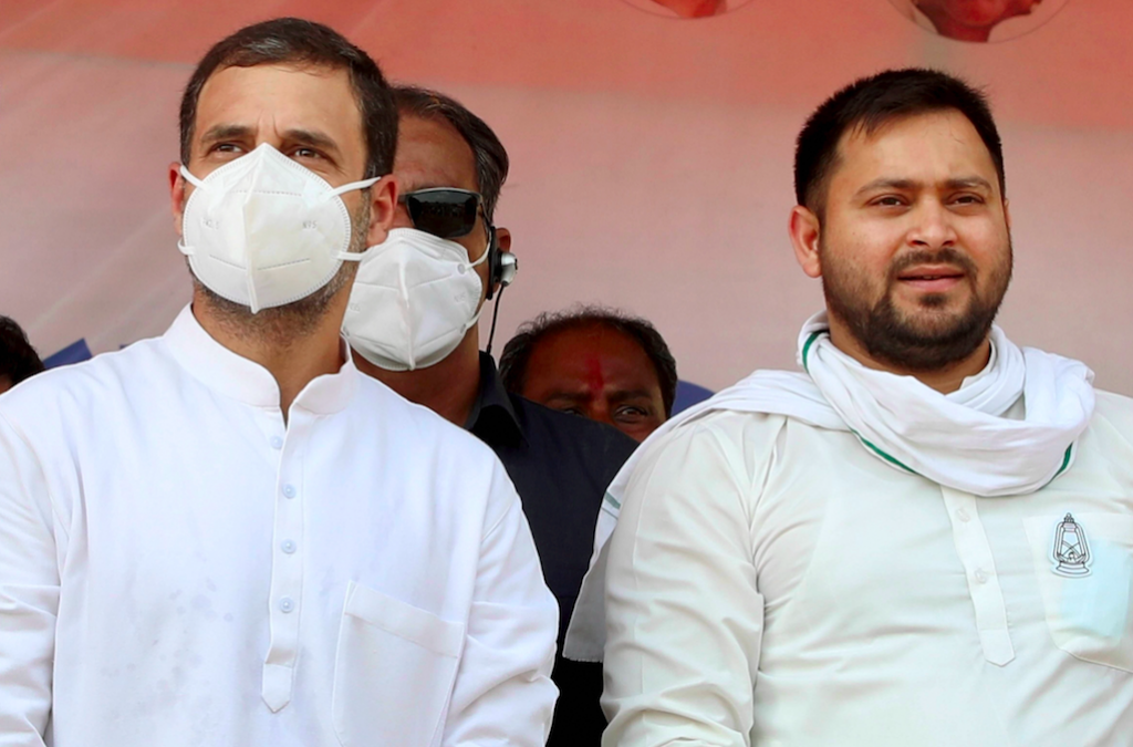 File image of Rahul Gandhi with Tejashwi Yadav. Photo: PTI