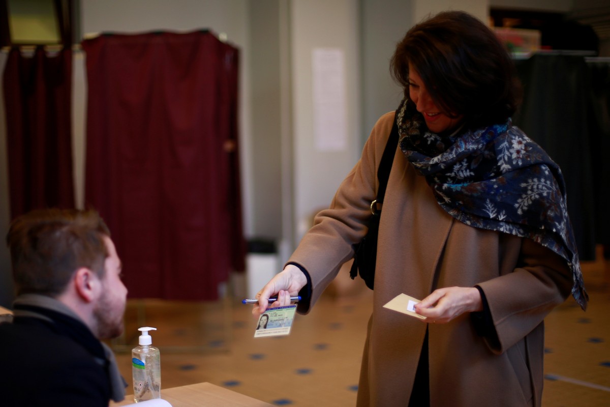 Paris mayor candidate Agnes Buzyn shows her identity card prior voting, Paris, France March 15, 2020. Rafael Yaghobzadeh/Pool via Reuters