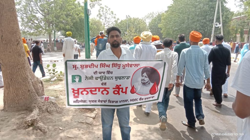 A man carries the banner of a blood donation camp organised during Sidhu Moosewala's bhog ceremony at Mansa on June 8, 2022. Photo: Kusum Arora