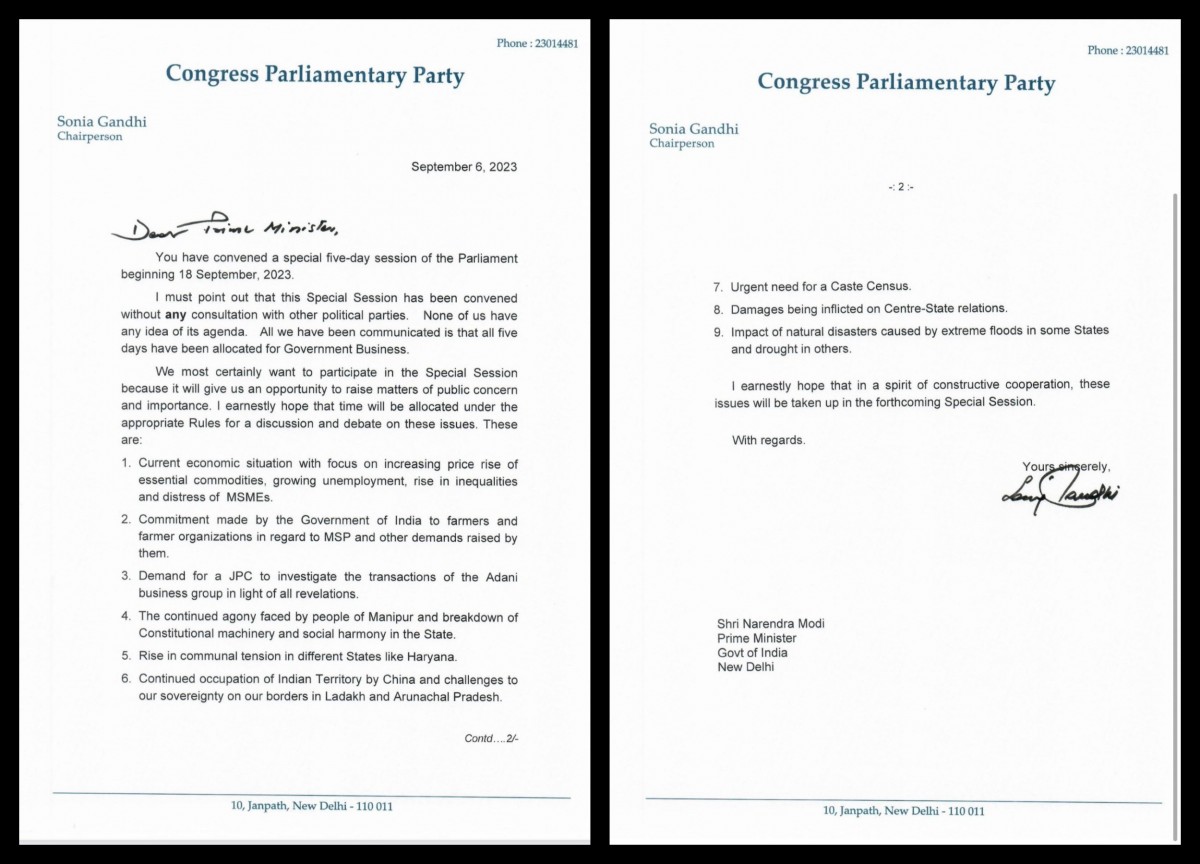 New Delhi: Since the Bharatiya Janata Party-led Union government is yet to reveal the agenda for the special session of parliament it has called starting September 18, the Congress party decided at a meeting on Tuesday (September 6) that Sonia Gandhi will write to Prime Minister Narendra on the matter. The letter, sent on Wednesday, detailed issues that the party – and INDIA alliance – think require parliament's attention.