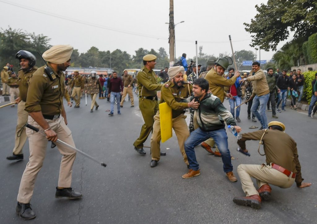JNU students lathi-charged by the police during their march to Rashtrapati Bhavan, in New Delhi, December 9, 2019. Photo: PTI/Kamal Singh