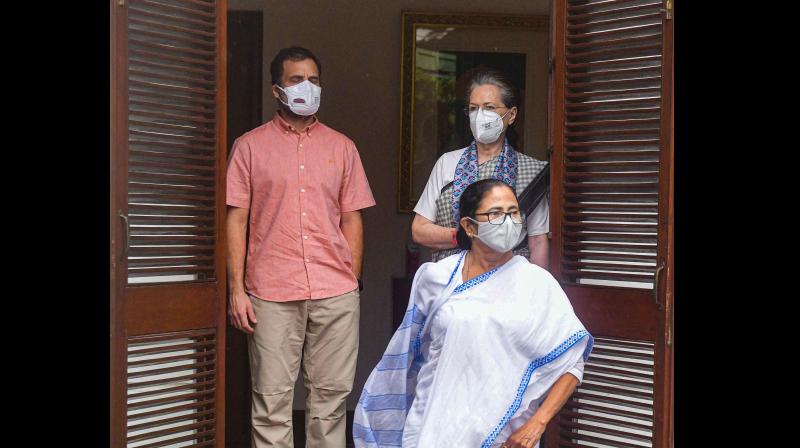 Mamata Banerjee met senior Congress leaders Rahul and Sonia Gandhi at their residence in Delhi in July. Photo: PTI.