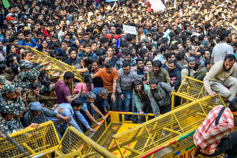 Thousands of JNU students, carrying placards and chanting slogans, marched towards Parliament on the first day of the winter session on Monday, demanding a total rollback of the hostel fee hike, but were stopped by the police around half a kilometre from the institute's campus in south Delhi.