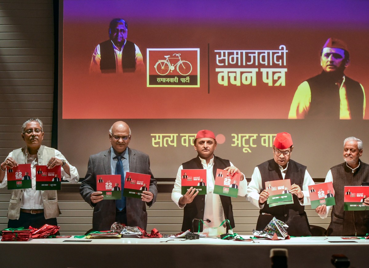 Samajwadi Party President Akhilesh Yadav and others release party manifesto ahead of state assembly elections, in Lucknow, February 8, 2022. Photo: PTI.