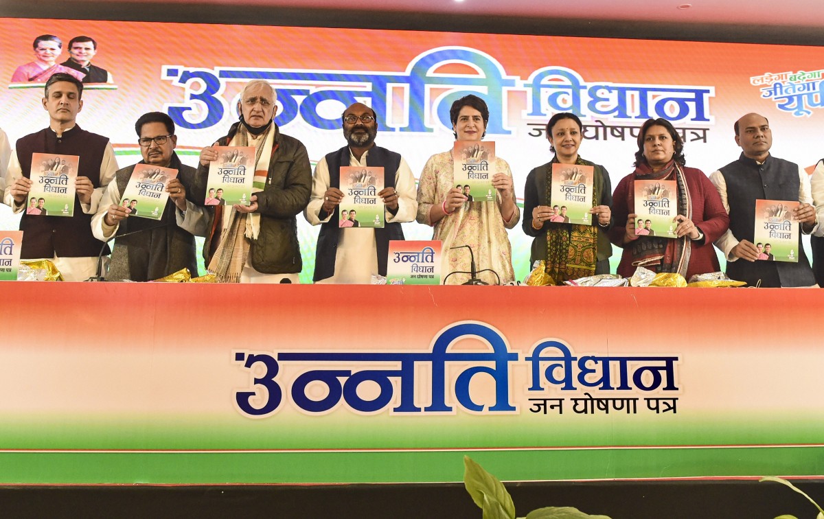 AICC general secretary Priyanka Gandhi Vadra and others release 'Unnati Vidhan Jan Ghoshna Patra' for the Uttar Pradesh Assembly elections in Lucknow, on February 9, 2022. Photo: PTI.