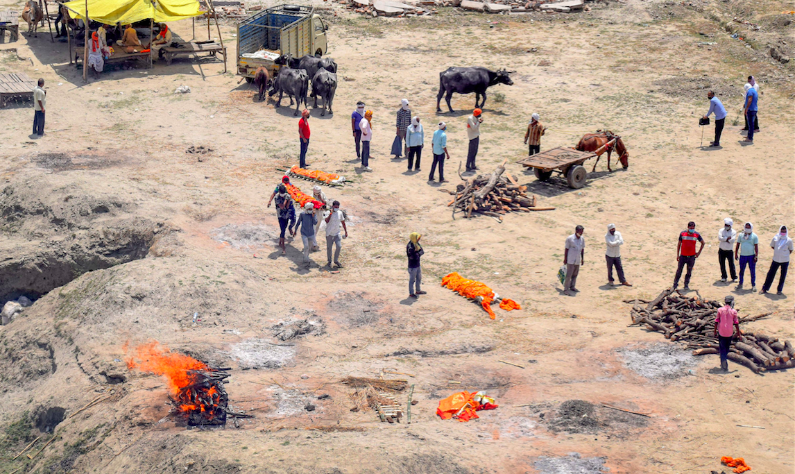 Family members and relatives are seen around the burning pyres of victims who lost their lives due to the Covid-19 coronavirus at Daraganj Ghat near Sangam, the confluence of rivers Ganges, Yamuna and the mythical Saraswati, in Prayagraj, Wednesday, April 28, 2021. Photo: PTI
