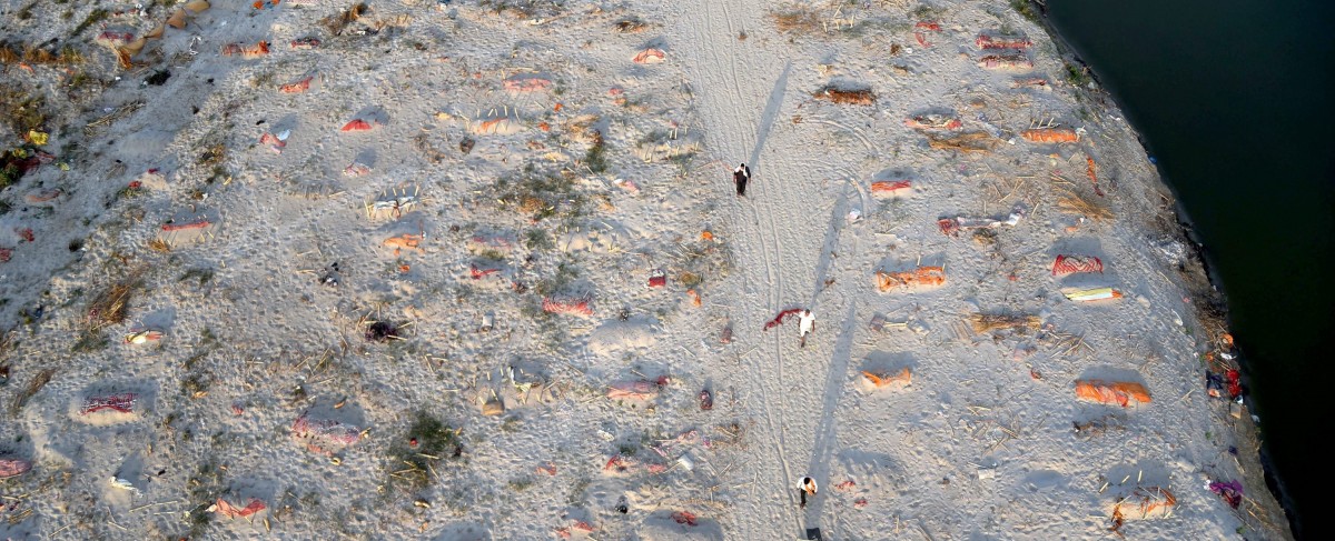 Bodies of the deceased buried in the sand near the banks of Ganga river, allegedly due to shortage of wood for cremation, during the second wave of coronavirus, at Shringverpur Ghat in Prayagraj, Saturday, May 15, 2021. Photo: PTI