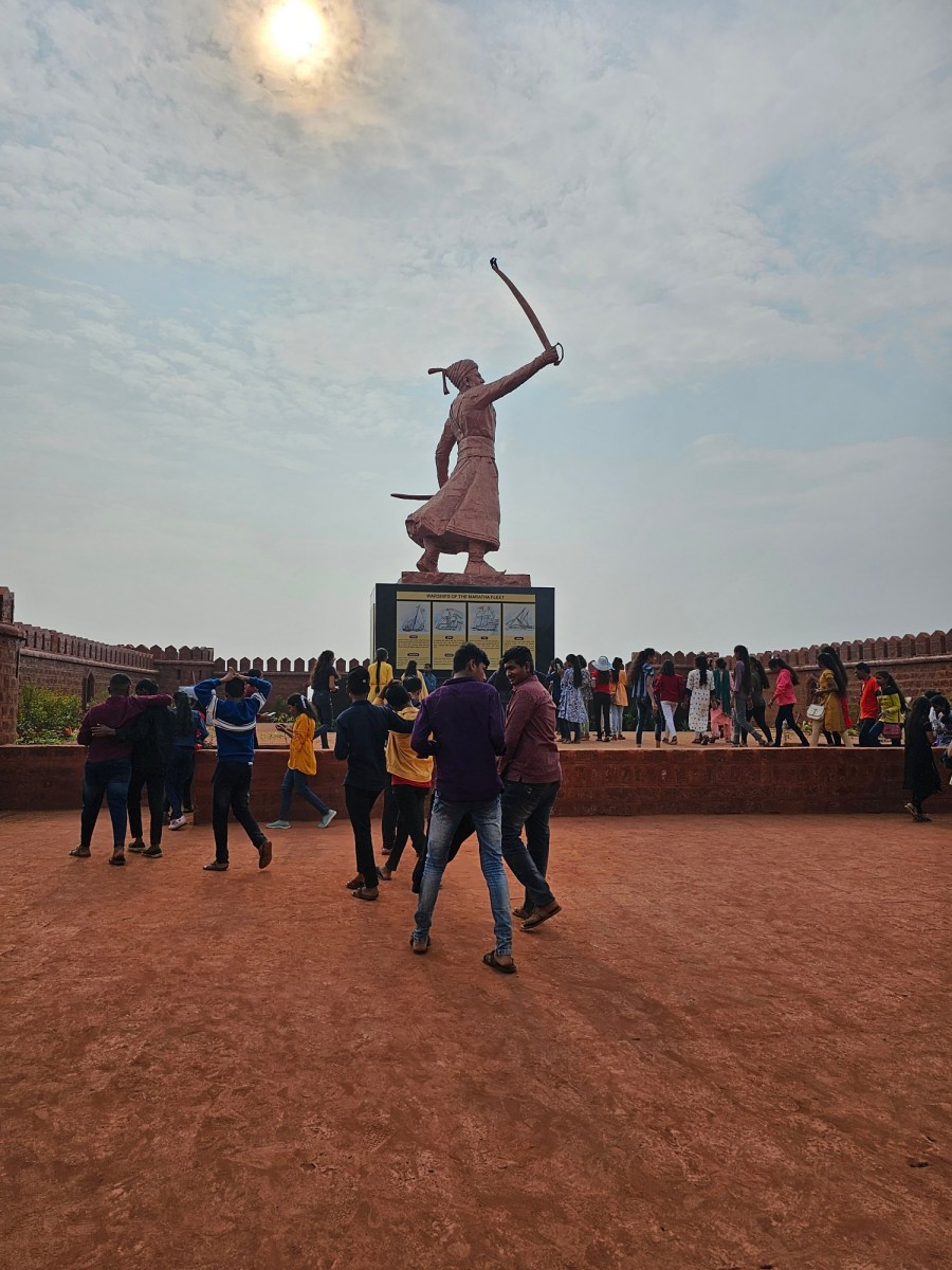 Two weeks after the event, I happened to be in Malvan for personal reasons, from where feverish WhatsApp groups had been reporting for months before the Navy Day on the various ceremonies that had been planned after the prime minister announced in his radio broadcast Mann Ki Baat last April that the focus of celebrations would be the glorification of Maratha Naval history. My interest in how “publics” are constituted around statues, particularly around the recent escalation of sculptural interventions to shape people’s perception, led me one morning to visit the site, which despite the relatively early hour, was clogged with tourist buses trying to negotiate the narrow lanes of what up until a few weeks ago was an unassuming fishing hamlet. Walking through the maze of the town’s lanes leads one to the base of Rajkot, a rocky seafront outcrop, facing the Sindhudurg fortress across the sea. It was once the site of an ancillary fort of the 17th century where today there stands a theme-park-like recent reconstruction, with plaster of Paris guards positioned at the gate. A veneer of shiny varnish covers the natural red laterite stones, used to hastily construct the walls of the faux fortification that surrounds the newly installed sculpture.