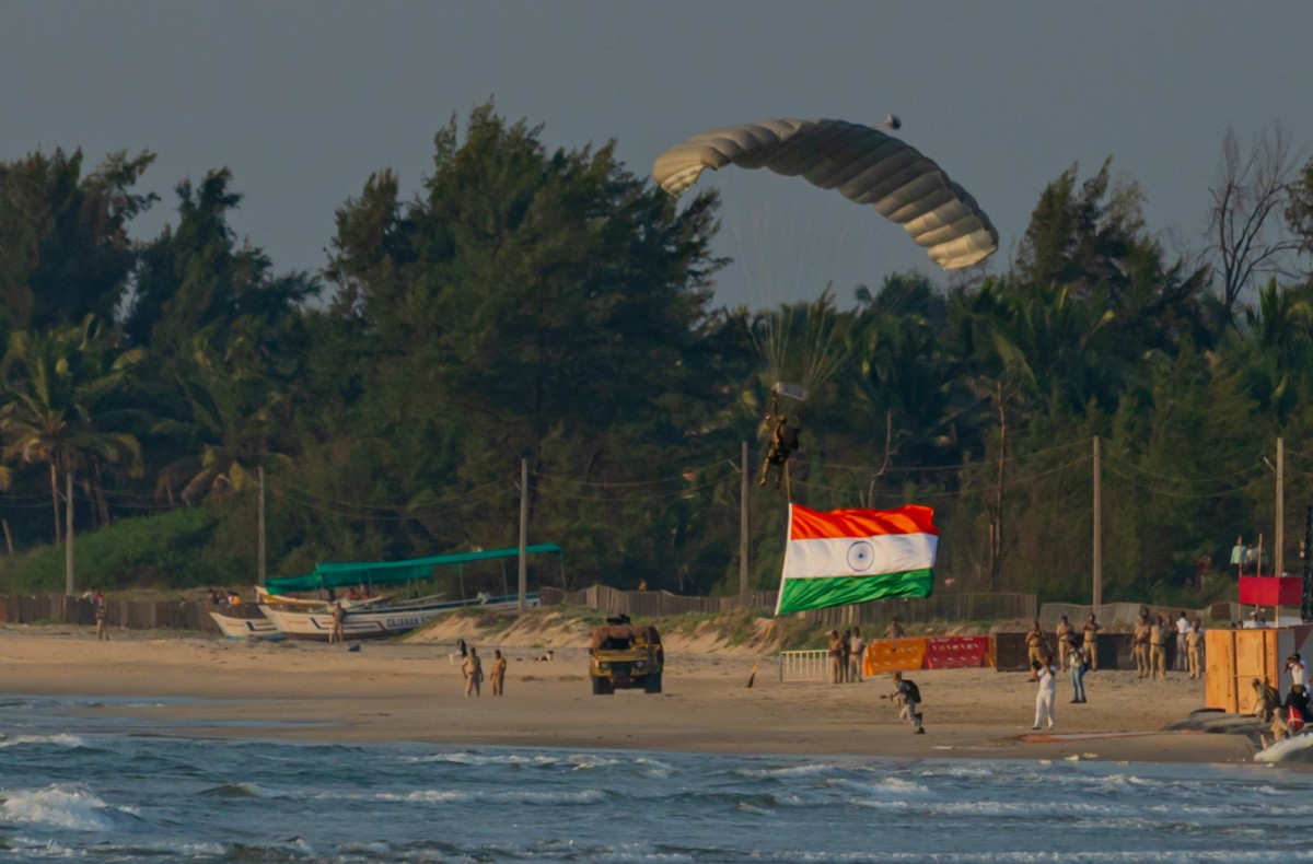 Eventually though, I was able to get some images from a member of the public who did witness the events and had access to a better-quality camera phone. The images taken by him reveal paratroopers landing on the beach front, flying the Indian tricolour in a mock display of a sea front confrontation with an imaginary enemy. Another reveals a fireball in the shallow waters of the sea, brought about by what looks like a drone in the sky, shooting at a ground level target. A fly-past as well punctures the sky. It certainly appears that the Indian Navy is well prepared for any threats to India’s territorial integrity, as long as environmental concerns are ignored.