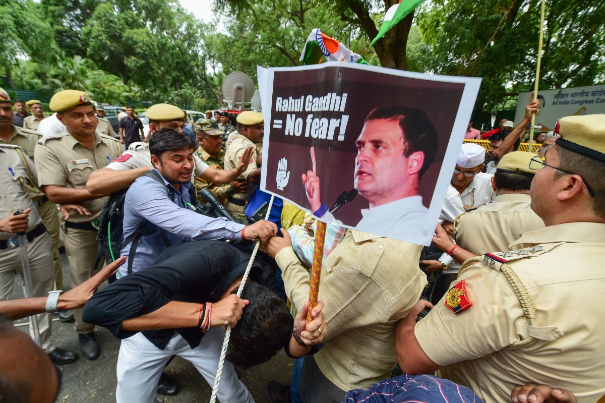 Congress workers being detained during a protest march outside the AICC headquarters ahead of party leader Rahul Gandhis second appearance before the Enforcement Directorate (ED) in the National Herald case, in New Delhi, Tuesday, June 14, 2022. Photo: PTI.