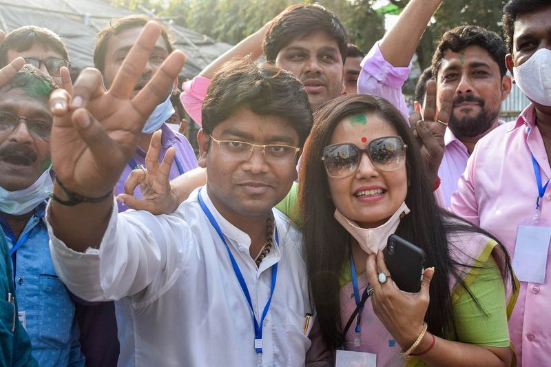 Trinamool Congress (TMC) activists celebrate after the party's victory in four West Bengal assembly constituencies, in Nadia, November 2, 2021. Photo: PTI