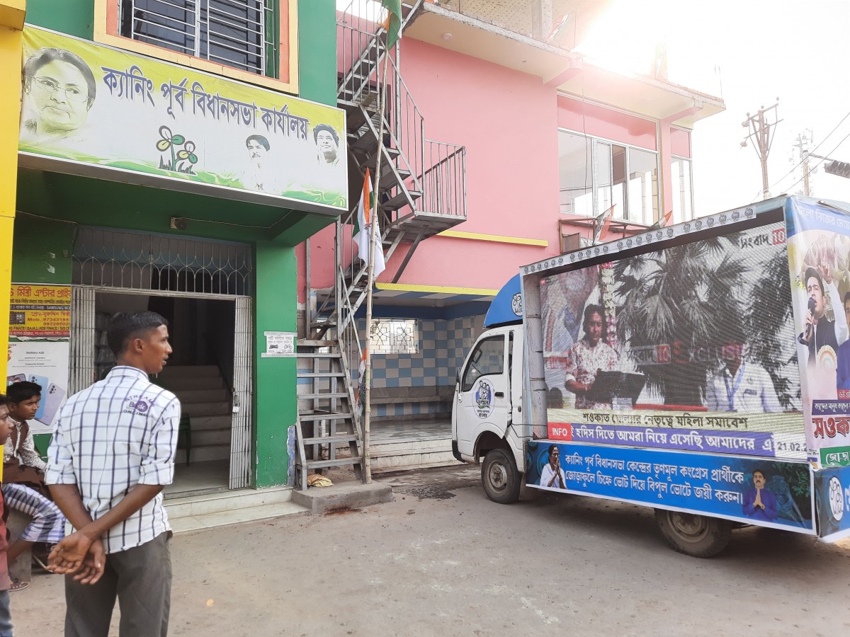 TMC's portable campaign vehicle outside the party's office at Jibantala in Canning East. Photo: Snigdhendu Bhattacharya