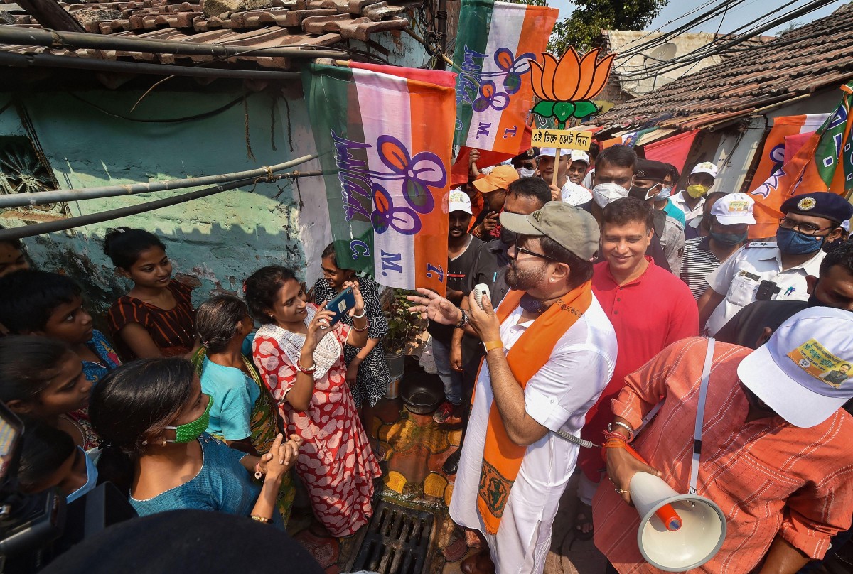 BJP candidate Babul Supriyo, contesting for Tollygunge seat, sings Rabindra sangeet during his door-to-door election campaign for West Bengal assembly polls, in Kolkata, Monday, March 29, 2021. Photo: PTI/Swapan Mahapatra