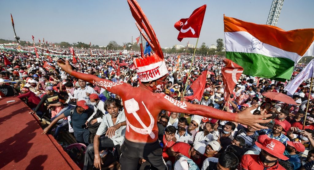 Supporters during a joint rally of Left, Congress and Indian Secular Front (ISF), ahead of West Bengal assembly polls in Kolkata, February 28, 2021. Photo: PTI/Ashok Bhaumik