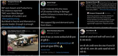 Actor Kangana Ranaut also tweeted a provocative message calling upon Prime Minister Narendra Modi to take revenge and unleash violence in Bengal, which led to her suspension from Twitter. Many right wing handles are demanding military action and the implementation of the National Register of Citizens. They also allege that ‘infiltrators’ are involved in the violence. This is a coded incitement against Bengali Muslims.